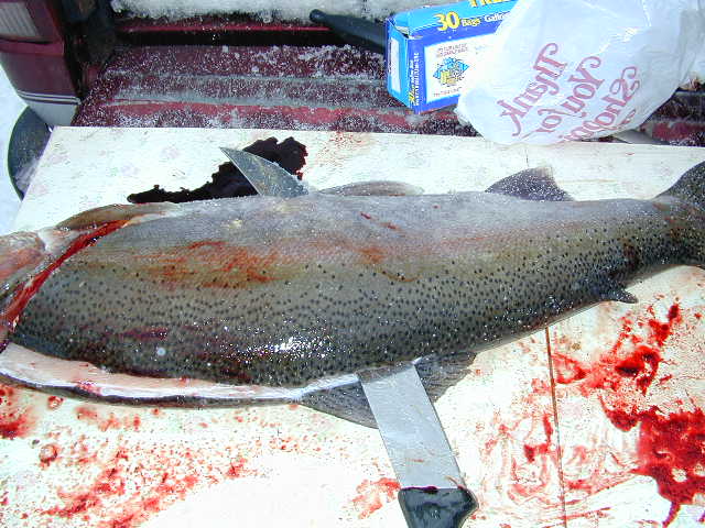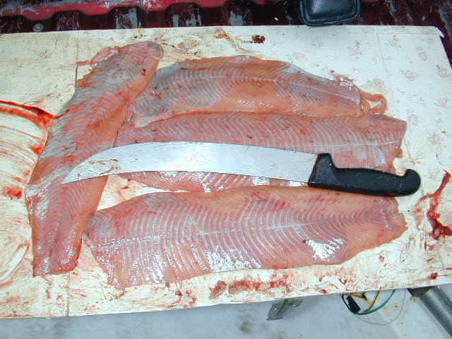 Fishing Filleting Cleaning fish is either a pain in the boot-tay or a glory depending on how you a attack the job. Once you've mastered the skills at becoming a productive fisherman you'll be faced with the problem of how to clean a large amounts of fish in a speedy fashion, without the cleaning table and you becoming a mess. Also, how to fillet a fish, so it don't look like the neighborhood dog has been chewing on it, is more than helpful. If an eye appealing product is what you're after, read on. Filleting is an art form when done correctly. The Knife This is the all important tool that will do the job for you only if it's sharp and I mean razor sharp. Those small thin bladed, flexible fillet knives that will work fine on pan fish and maybe the smaller variety of Walleyes are over matched when it come to a 10 pound Steelhead or a 20 some pound King or Chinook. On these fish you'll need a reel knife with backbone and the ability to hold an edge, I use a 12 inch Forschner, the ones professional butchers use to cut up the meat you buy at your local market. Forschner Knives are made by the same people who make the famous "Swiss Army Knife." Hopefully, I can find a distributor and have them available for you by the start of the big lake season. Be advised these knives are not cheap, but the quality and the name speaks for itself! Sharpening Tools You're going to need a sharpening steel and the skills to use it. Diamond sharpening steels are even better, if you can find them. A ceramic steel is nice if you can lay your hands on one too! These tools will keep the razor sharp edge, necessary to lay perfect fillets on the table. Besides, a dull knife is darn right dangerous, so extra sharp is the only way to go. I'll spend at least 5 minutes putting an edge on a knife if it's in need of it. Because the time savings a good sharp knife is worth it, and it will save you overall time in the long run. A good edge is like power steering and will glide thought the toughest hide and flesh with amazing ease. The Technique Make the first cut just behind the gills without going too deep and turn your knife towards the tail of the fish. This part here takes some practice but the object is to leave the entrails intact without spreading fish feces and bile all over flesh (see above photo). Press down slightly on the heel of the knife, and run the blade over the top of the fishes rib cage. This can be accomplished more easily if you attack the rib bones at a slight cross angle and let the knife follow the contour towards the tail. Once the end of the rib cage is felt, flatten out the knife and continue towards the tail. Remember, to use the entire edge and slice through the fish, not trying to just drag it towards to tail. By using the entire edge the blade will have a tendency to retain it's edge longer too. Skinning Stop just before you reach the tail and