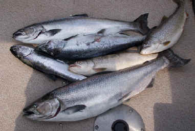 Since the demise of the alewives and salmon around 2003 in Lake Huron , the fishing has changed dramatically.  This includes both bait fish, as well as the size and numbers of salmon.   The variety of species available to catch has also changed.  But, this has been a real bright spot!  Lake Huron has turned into a fabulous multi-species fishery.  In 2007, it was very common for us to come in with Chinook salmon, Coho salmon, Steelhead, and Lake Trout.  Our fish box also contained an occasional Atlantic salmon and Brown Trout, along with a stray Walleye.  We’ve had these terrific catches just about every trip in 2007.