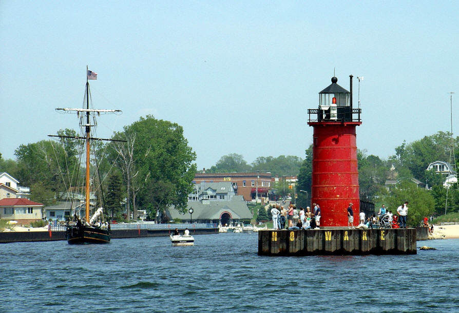 | The page is under construction and will only be finished when I have all port entrance photos of Lake Michigan. This page contains navigational tips & landmarks to go by when traveling to the southern part of Lake Michigan. This is a major journey of about 150 miles by water between Manistee and South Haven. Moved the boat south for the improved fishing Salmon in the southern end of Lake Michigan. The main body of Lake Michigan over 60 foot water depths and deeper was 38 in Manistee to 42 degrees in South Haven, except off Saugatuck where I had 44 degree water off the Kalamazoo River. On the water marina gas prices were $1.87 in Manistee, $1.89 in Muskegon and $1.99 in Grand Haven on May 3, 2003. |