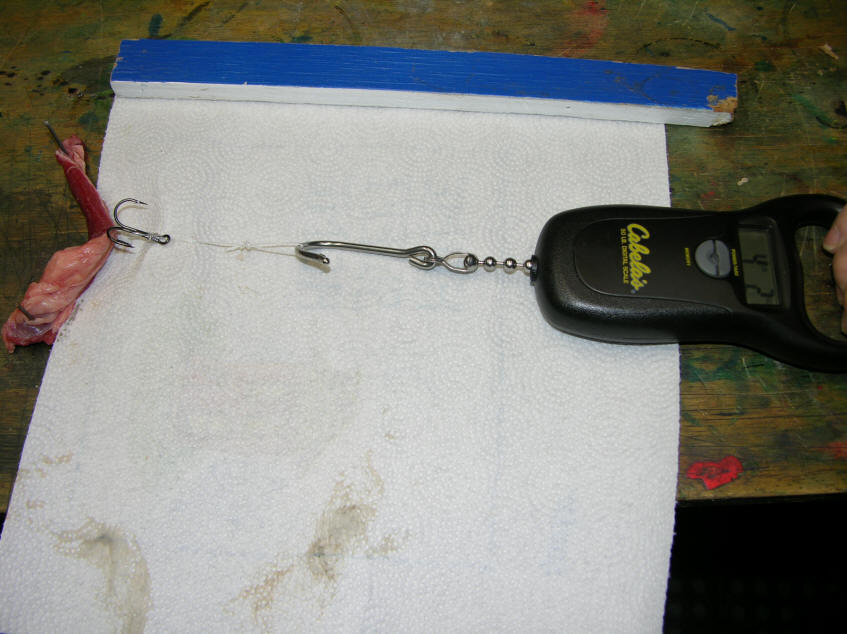 On 1/3/11 we did a pull test with a scale on a piece of tough gristle cut from round steak. 13 ozs of pull was required to pierce thru past the barb. We used the same VMC #1 hooks like on our meat rigs and trolling flies. While the needle point penetrated with far less pressure 13 ozs is when the barb came completely thru. A 4 pound draw had stretched this leathery chunk of meat and had total mastery over it. Do these Releases Work with No Bands Too?