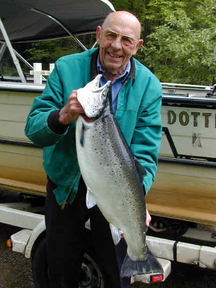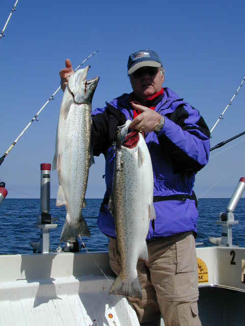 Organized Confusion? How do I find fish? This question can be answered. Responding to this requires much thought and takes the "Wisdom of Solomon" to give a satisfactory retort. Simply put, it's like trying to find a needle in a haystack, quite a discouraging task to say the least. Putting the odds in your favor can, and will help solve this problem, or look at it like I do, solutions can be found to any problem. Now, if I were looking for the proverbial "needle in the haystack" with 21st century technology, the smart bet would be to find a metal detector and start sifting through the hay. Sooner or later you will find the needle. The same case scenario, exists in finding the elusive quarry in the Great Lakes known as Mr. Sal Maniod. Using modern day electronics, past experiences and just plain being lucky will aid in your pursuit of being a successful fisherman. Using past experience and known fish migration patterns will help you to find what you're after, a full box of fish. Now, before you begin your "magic carpet ride" to becoming a "Salmon Slaying Star," you'd better be on the alert to constantly changing conditions. Paying attention to the details or clues will help you solve the Great Lakes Puzzle and soon you'll be reaping the rewards of a screaming drag and a bent rod. Use common sense and you won't be playing "pin the tail on the donkey" blindfolded. Being aware to ever changing conditions and having equipment that you can rely on is the secret, savvy anglers utilize. It has often been said, that 10% of the fishermen catch 90% of the fish and I believe that statement to be exceptionally true. Wanna join the select top 10%? Then read on................ Sonar The sonar development and refinement took place back in WW II as a defense against German U-Boat attacks. Men's lives were on the line and the reel smart people got to work on finding those sneaky Subs, that were decimating the Atlantic Fleet. So, don't think it was developed just so you could go fishing. Sonar works by sending down into the water a electronic radio pulse, then if a target is found then machine times the returning signal, so it can tell you how deep the scales and tails you're looking for is. The speed of radio signals are known, but don't ask me what they are. I swam under the transducer on my boat before and actually felt the pulse hitting me, when I was close enough to the transducer. My advice to you here is spare no expense when it comes to rigging your boat with a fish finder. I've used a Raytheon L750 for the past 3 seasons and the performance of the 750 is as good as my paper machine, the King 1350 with the 50 kHz transducer. The L750 is both a 200 kHz and 50 kHz machine and has more bells and whistles than I need to use. Remember, purchasing top notch sonar will give you an edge, like being able to mark defined thermoclines, spot bait and fish most other anglers don't even see. Study the instruction manual completely, modern day sonar units are as complicated to run as this computer I'm using to write this article. Use as high a power setting as the machine will take before blacking out, and discard any auto features such as fish I.D. Your fish finder is your underwater eyes and you're going to need at least 20/20 vision in conquering the Great Lakes. Special Note: Early season fish don't mark well, because the sonar mainly picks up the air bladder in the fish. In the cold denser water, fish don't need much of a air bladder to maintain neutral buoyancy. Information and Migration Gathering intelligence from reliable resources like a CIA Agent is called for. Use only knowledgeable fishermen for the answers to the questions of: what, where and why. Unless, you know the person personally, ignore idle radio chatter that can send you on a wild goose chase. Believe me, if you fish out of a port more than a few times you will get to know other fishermen who are willing to share their info with you. Good info is a two way street and should be shared as much as possible. Scour the Port Reports page on this website, the hot lures from one port tend to work in all ports. Use the temperature charts on the Great Lakes Info page I done. The surface temp thing usually only works for spring and early summer fishing. Once warm water forms all the way across the lake, the fish will tend to become thermocline orientated, which means they'll be deep as a rule. Pay careful to pay attention to surface feeding gulls, they could be signaling large schools of bait fish near the surface. The gulls have to fish for a living and we don't. So, be watchful when it comes to where the dumpster ducks are feeding. Using the migratory patterns of a Salmon, because "all's fair in love and fishing." In the beginning of the season you have to go hunting for the Mr. Fins N. Gills, however the spawning urge works in your favor as the Salmon begin staging and gorging themselves off the major rivers that empty into the Great Lakes. As a matter of fact, the fish are looking for you, and everything just got a whole lot easier. In Manistee, Michigan the adult Salmon begin entering both the Big and Little Manistee Rivers around the first part of July. All be it may, the first run of fish isn't huge, but it signals what's to come. The Chinook or King Salmon Fishery that exists in our area means that all the fish don't run at the same time. Throughout mid-July through mid-September means the Kings will be entering our rivers everyday in decent numbers, so for about 2 months we have an excellent Salmon Fishery. If the lake rolls over and we get reel cold water outside the pier heads, our harbor fishing is incredible. I guess the point that I'm trying to make here is that, somewhere within striking distance of your home port there will be schools of hungry fish waiting to attack your offerings if you're in the right spot and you did your homework. Crowd Control Using the hordes of fishermen that descend of the Salmonvilles of summer to your advanta